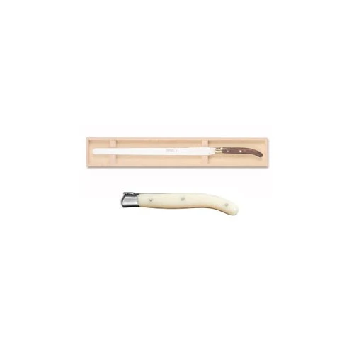 Le manche de ce couteau Laguiole pour poisson est en nacrine ivoirine. Chaque modèle possède une mitre inox.