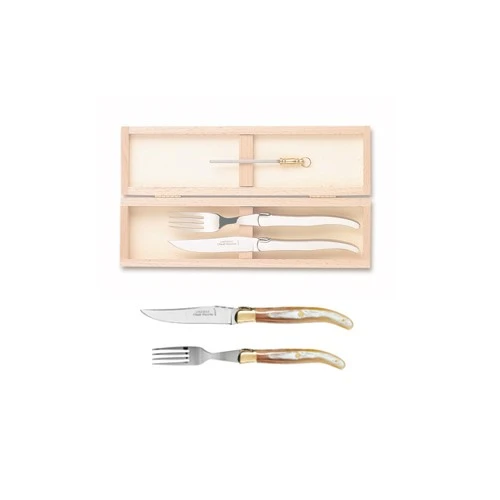 Ces couverts de table classiques possèdent un manche disponible en différents modèles : qui se décline en bois exotique, corne claire, méthacrylate naturelle ou écaille. Ils sont délivrés dans un coffret hêtre de 2 places, et les manches en méthacrylate sont compatibles avec un lavage au lave-vaisselle.