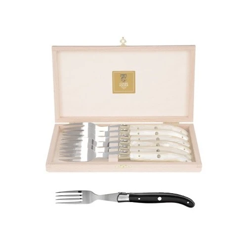 Cette fourchette de table classique possède un manche en méthacrylate, qui se décline en noir ou en ivoirine. Elles sont délivrées dans un coffret hêtre de 6 places.