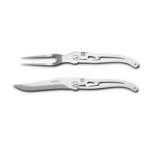 Directement inspiré de nos couteaux de poche Liner Lock Laguiole, ce service à découper original est composé d’une fourchette et d’un couteau pliants :
