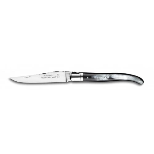 Il possède un manche en pointe de corne claire ou corne noire. Sa lame en acier X50CrMoV15 est extrêmement tranchante et très facilement réaffûtable. Le fil tient également très longtemps.