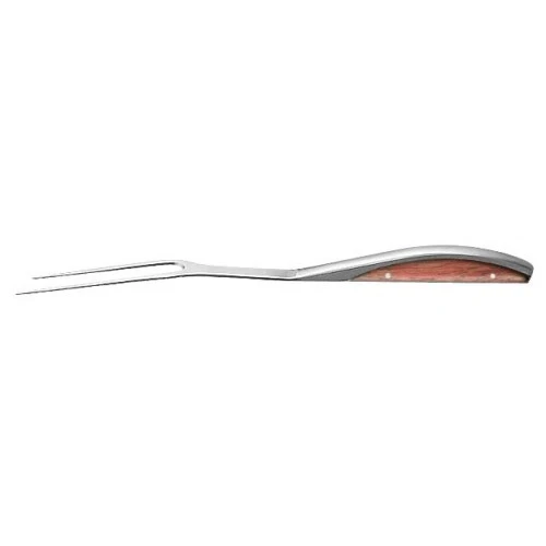 La garde de protection en inox massif sur son manche en fait une fourchette de cuisine moderne et esthétique. Elle est disponible avec un manche en bois exotique ou en méthacrylate noir.
