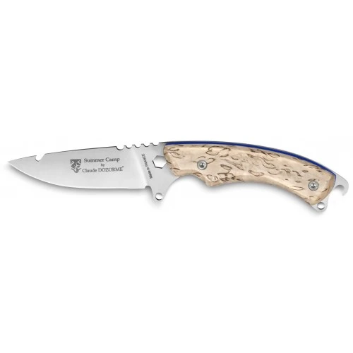 Ce couteau outdoor est disponible avec manche naturel en bouleau nain et platines bleues.